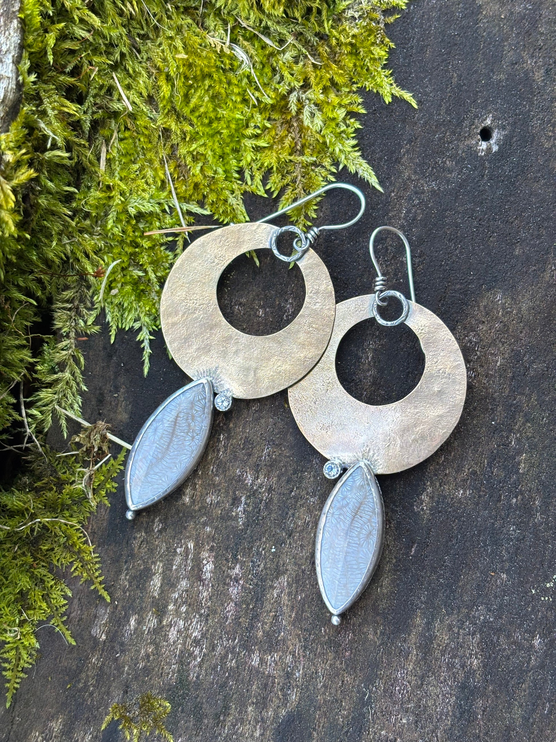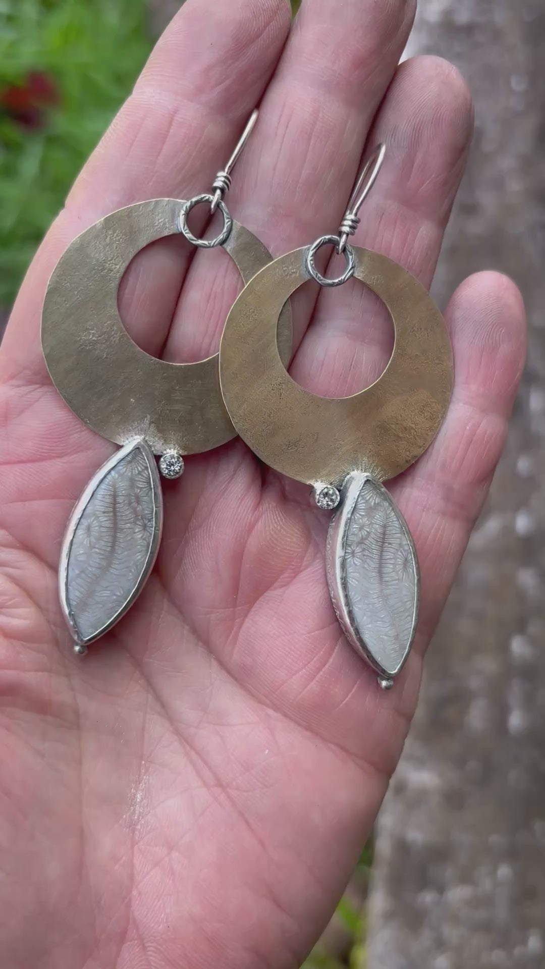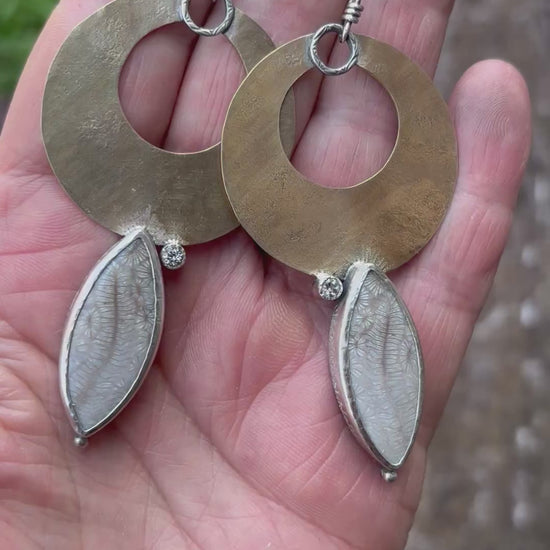 Handmade brass and sterling silver earrings with gray Fossil Coral cabochons wrapped in fine silver. Also, featuring 3mm white Topaz accent stones. Earrings measure 3.25” long and are a medium weight at 8.5g. Earring hooks are sterling silver. Handmade in VT.